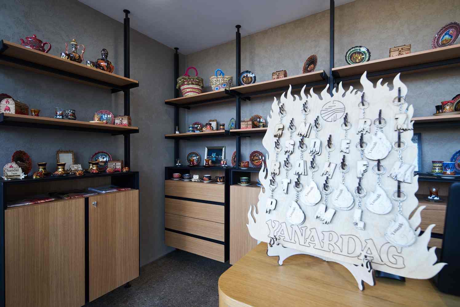 "Yanar dağ" suvenir mağazasında keramika, şüşə, taxta və parçadan hazırlanmış əl işi suvenirlər satılır. Hədiyyəlik əşyaların hazırlanmasında "Yanar dağ"ın ruhunu və qoruğun ümumi məzmununu əks etdirən ornamentlərdən istifadə olunub.